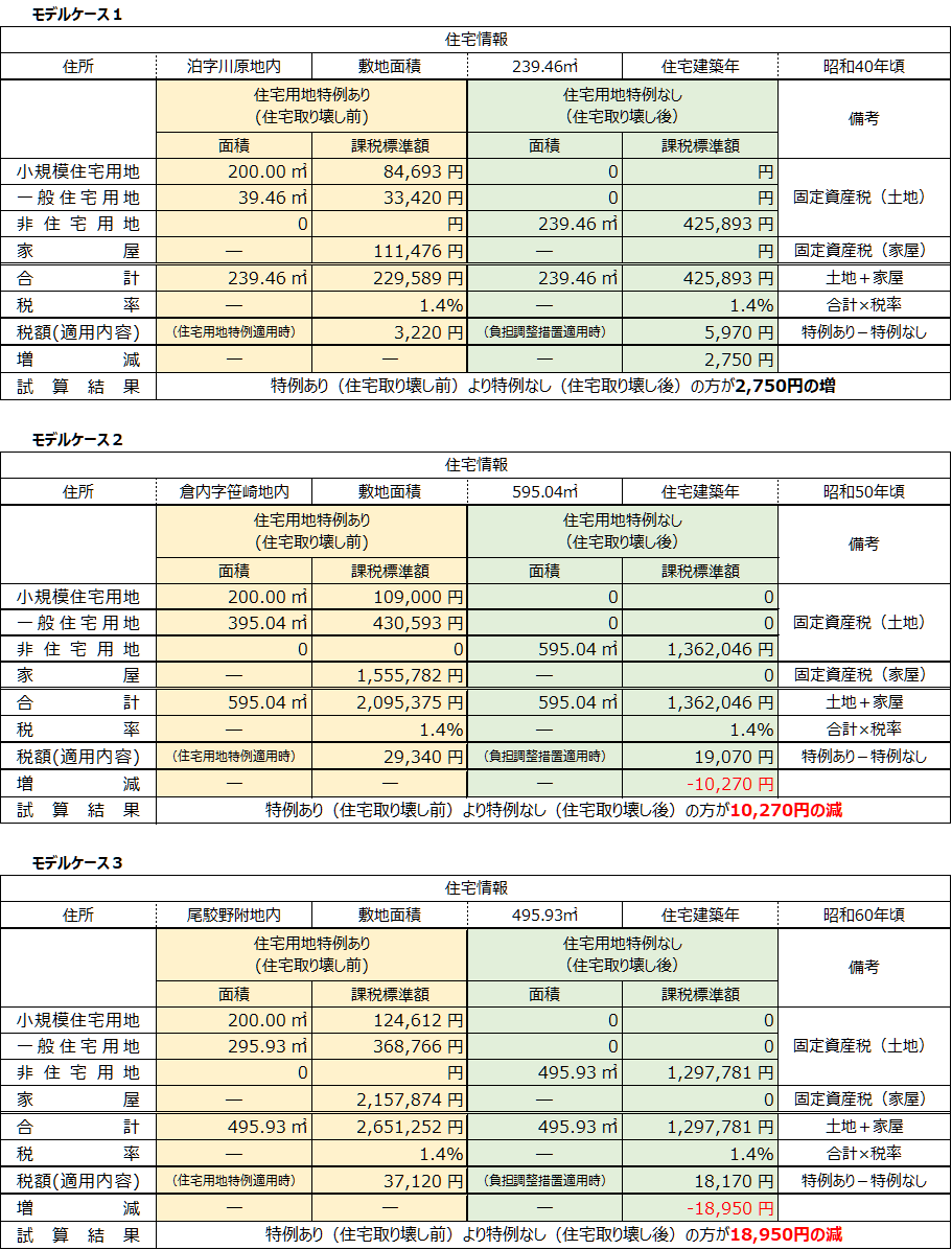 村内3ヶ所をモデルケースとして住宅解体前(住宅用地特例あり)と住宅解体後(住宅用地特例なし)の
