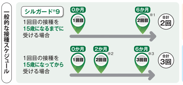 ※2・3 2回目と3回目の接種がそれぞれ1回目の2か月後と6か月後にできない場合、2回目は1回目から1か月以上(※2)、3回目は2回目から3か月以上(※3)あけます。