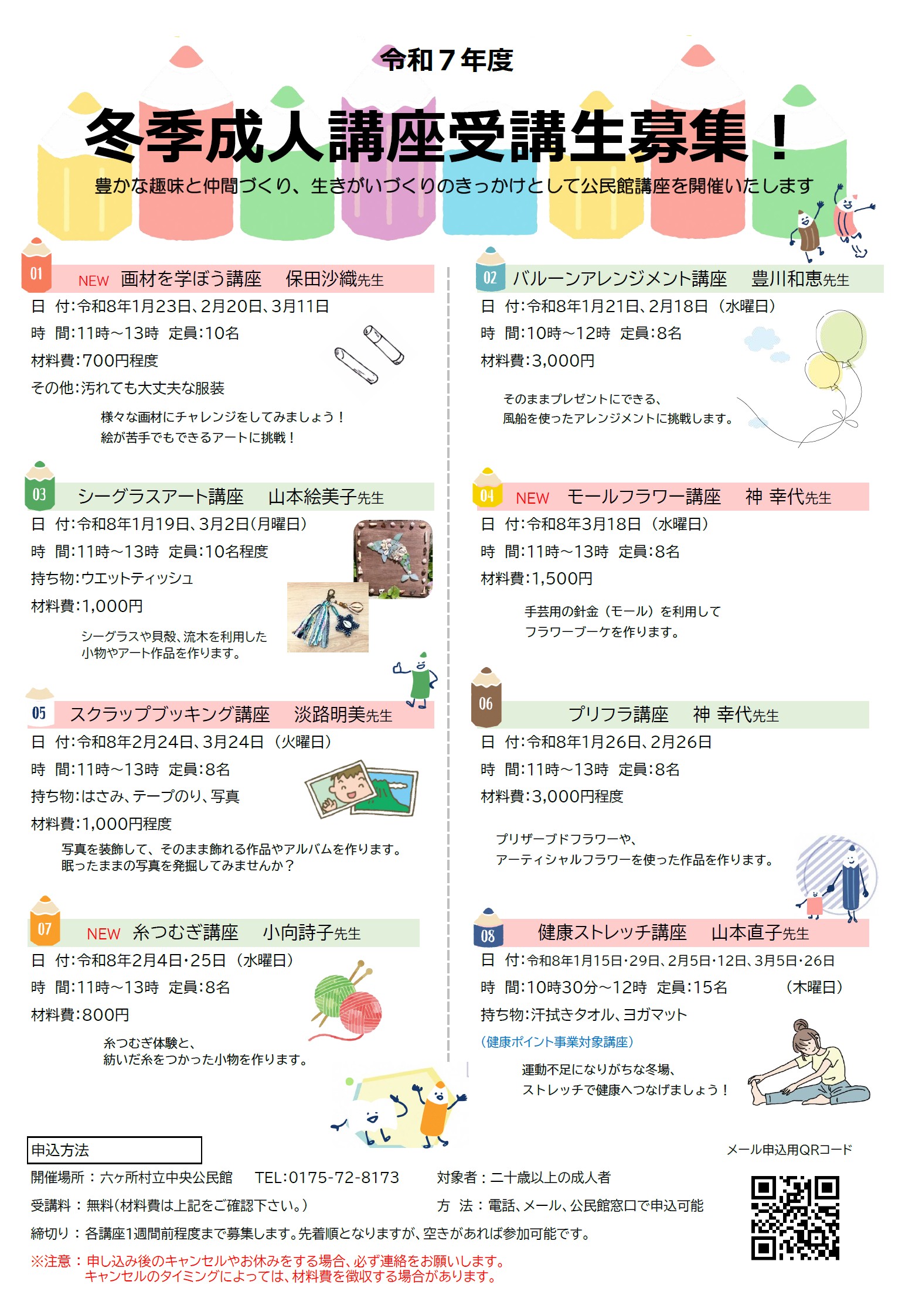 - 締切り:各講座1週間前まで募集します。先着順となりますが、空きがあれば受講可能な場合がありますのでお気軽にお問合せ下さい。